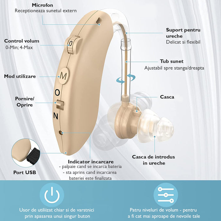 Acest amplificator auditiv este ușor de utilizat și reglabil pentru diferite tonuri.